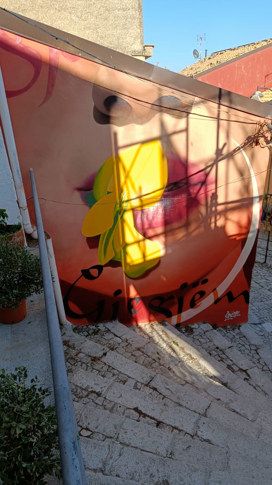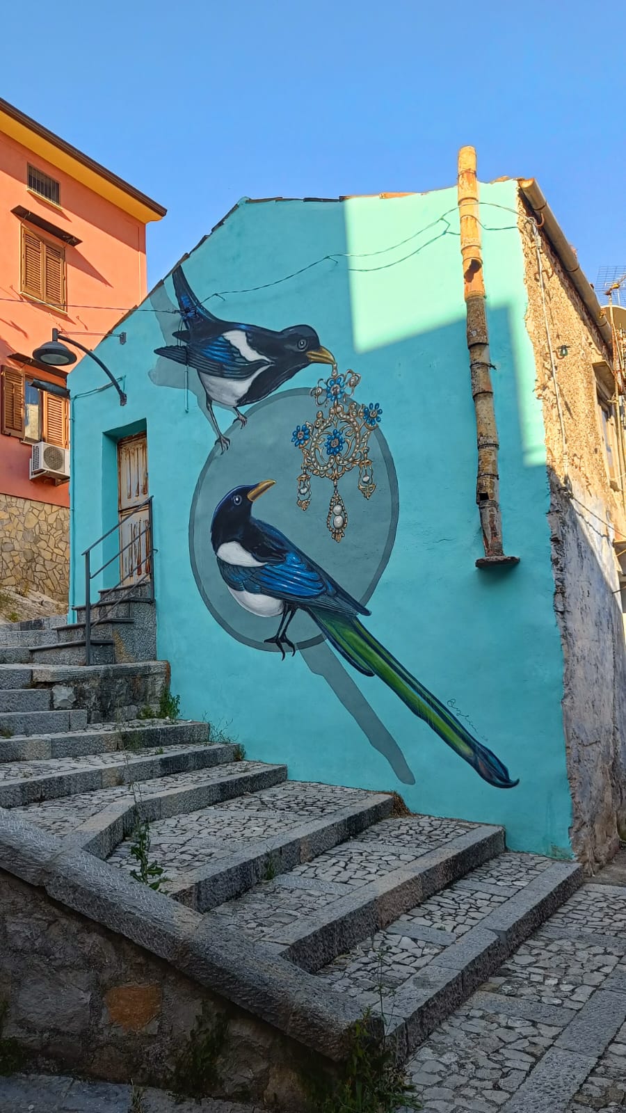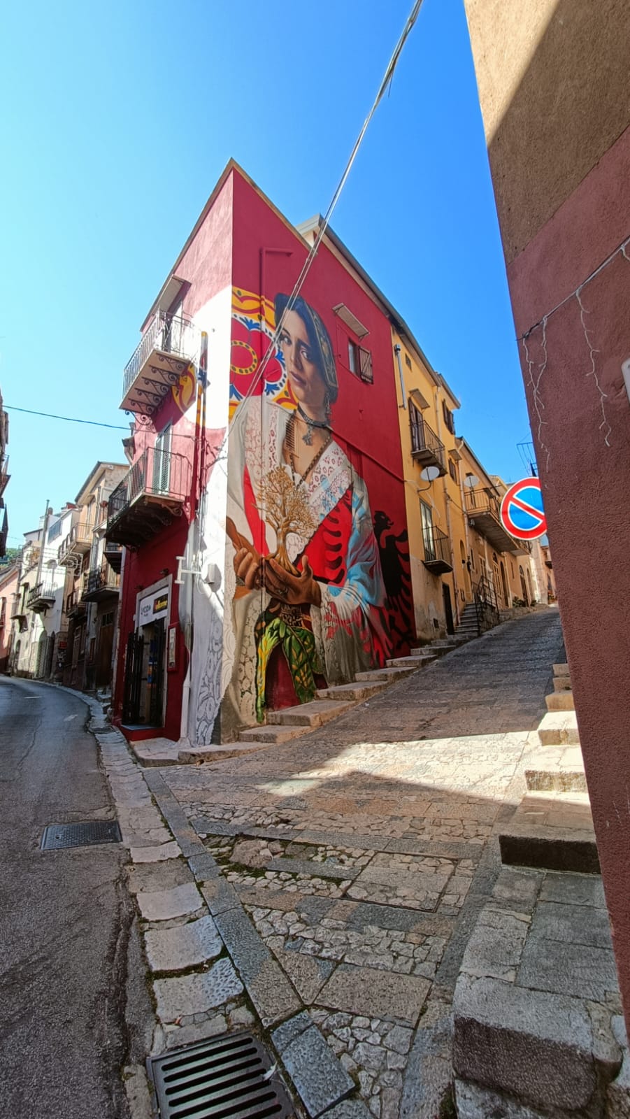 Immersed in the greenery of the Palermo mountains, Piana degli Albanesi surprises not only for its Arbëreshe history and the beauty of its traditional costumes, but also for a new form of urban storytelling: murals. Walking (or rather, pedaling) through the streets of the village, you come across ancient faces, modern symbols and suspended creatures that speak of identity, resistance and beauty.
